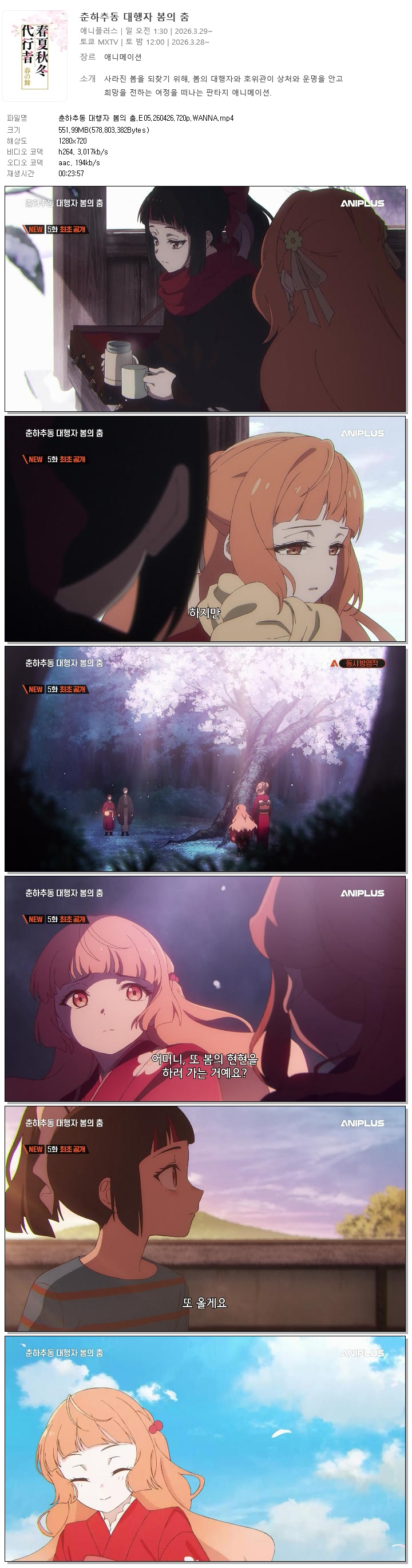 애니 춘하추동 대행자 봄의 HOT 춘하추동 대행자 봄의 춤.E05.260426.720p.WANNA 바오*** 2026-04-26 7,050 552 MB 다운로드 파일 1개 춘하추동 대행자 봄의 춤.E05.260426.720p.WANNA.mp4 552 MB TAGS 춘하추동 대행자 봄의 E05 WANNA 추천 224 북마크 공유 목록