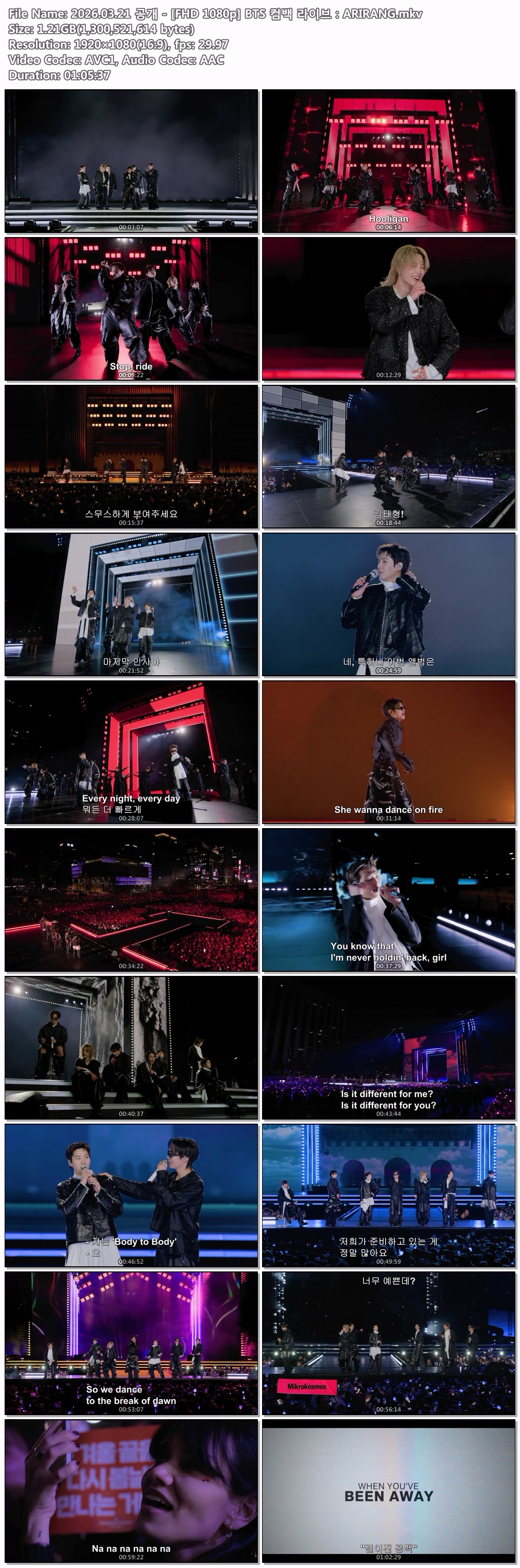동영상 공개 BTS 컴백 HOT 2026.03.21 공개 - [FHD 1080p] BTS 컴백 라이브:ARIRANG 07*** 2026-04-14 7,077 1.2 GB 다운로드 파일 3개 2026.03.21 공개 - [FHD 1080p] BTS 컴백 라이브:ARIRANG.jpg 1.2 GB 2026.03.21 공개 - [FHD 1080p] BTS 컴백 라이브:ARIRANG.mkv 2026.03.21 공개 - [FHD 1080p] BTS 컴백 라이브:ARIRANG.srt TAGS 공개 BTS 컴백 라이브:ARIRANG jpg 추천 235 북마크 공유 목록