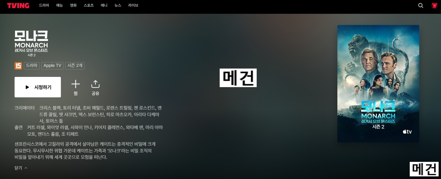 드라마 모나크 레거시 오브 HOT [A] 모나크: 레거시 오브 몬스터즈 2. 9화. (260424 공개) 10부작 예정 메건*** 2026-04-29 6,998 3.2 GB 다운로드 파일 2개 [시즌 2] Monarch Legacy of Monsters 9화 (파일, 제목, 스샷 도용 금지!! 작성자 메건).mkv 3.2 GB [시즌 2] Monarch Legacy of Monsters 9화 (파일, 제목, 스샷 도용 금지!! 작성자 메건).srt TAGS 모나크 레거시 오브 몬스터즈 9화 추천 396 북마크 공유 목록